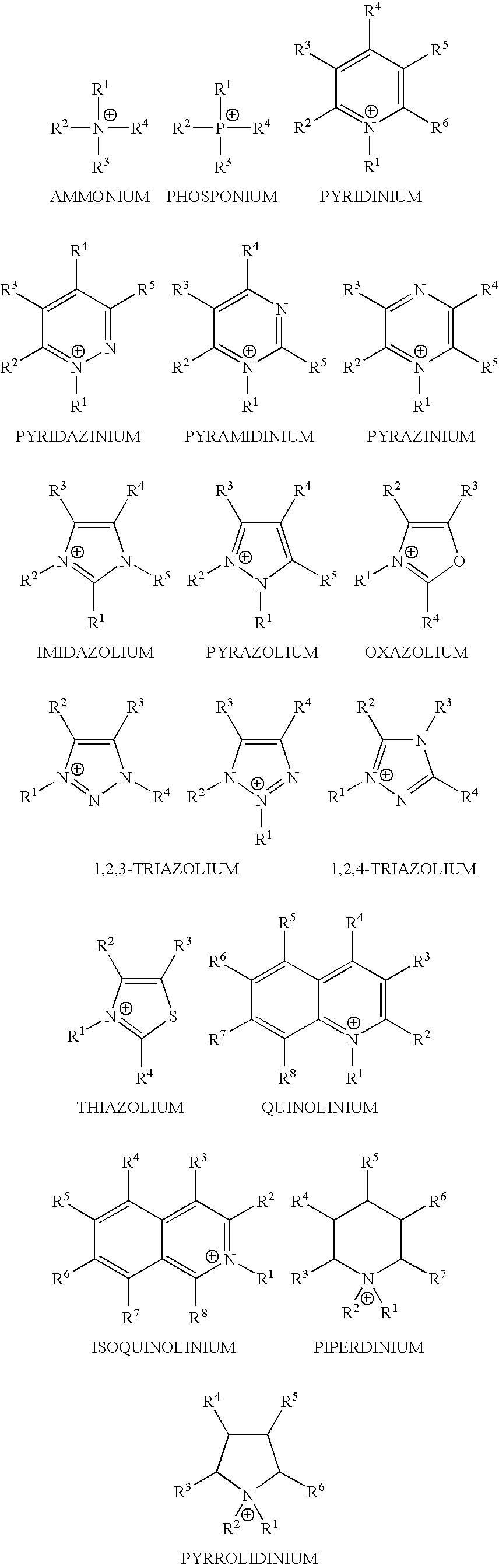 8 substituents are independently selected from the group consisting of H, C1-C6 alkyl, alkenyl, hydroxyalkyl, haloalkyl, alkoxylalkyl; C6-C10 aryl or C8-C16 alkylenearyl; and mixtures thereof, with the proviso that the cationic center heteroatom substituents not be H, i.e., the cationic center is a “hard quat.”