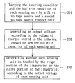 - the method includes the following steps. Firstly, the inducing capacitor and the built-in capacitor of the sensing unit are respectively charged by a first voltage source and a second voltage source. Next, an output voltage is generated according to the volume of charges applied to the inducing capacitor and the built-in capacitor. The value of the output voltage is either of the first potential and the second potential. Lastly, with respect to each sensing unit, whether the value of the output voltage is the first potential or the second potential is determined to decide whether it is the ridge portion or the valley portion of the fingerprint that touches the sensing unit.