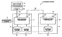 The second disk array device 4 has a second storage controller 21, a plurality of ports 22, and an external volume 23. The external volume 23 is an actual device formed on a physical storage device (a disk drive for example) provided inside the second disk array device 4. Since the external volume 23 exists outside when viewed from the first disk array device 3, this is referred to as an external volume as a matter of convenience. Nevertheless, from the perspective that the [external volume 23] exists inside the second disk array device 4, this is also an internal volume of the second disk array device 4.