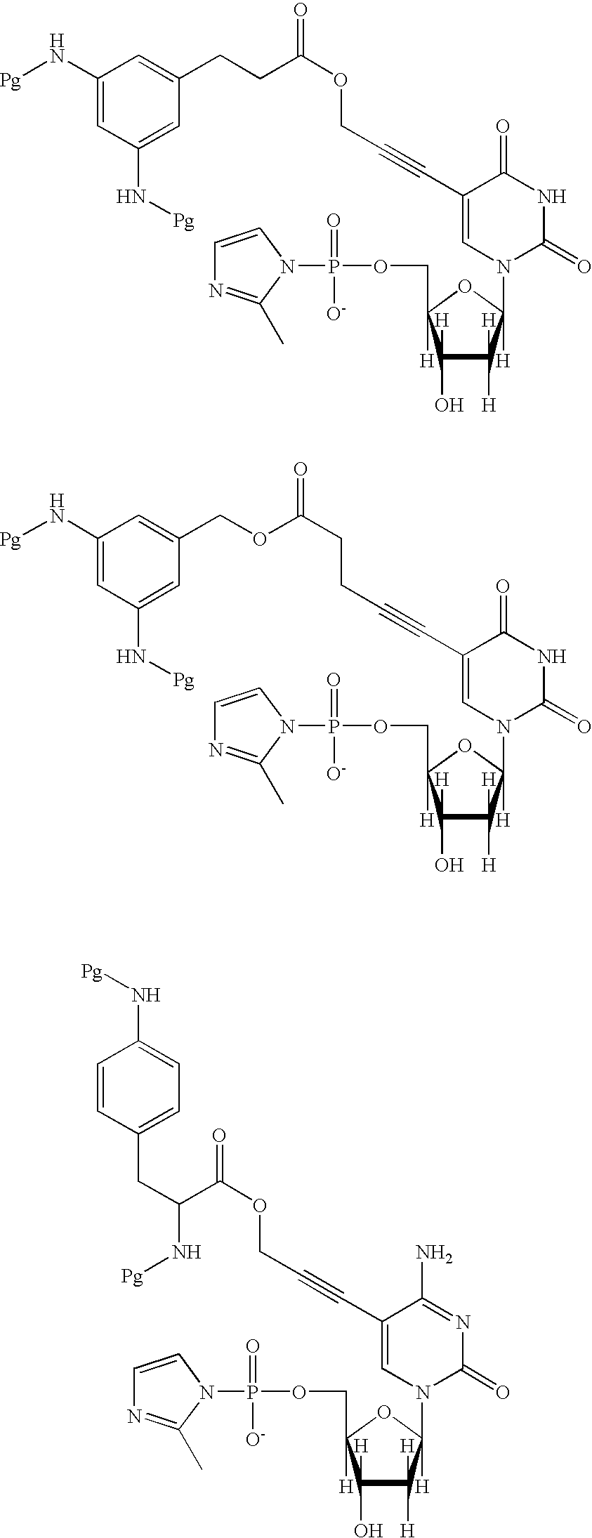 U.S. Pat. No. 6,175,001 relates to functionalized pyrimidine nucleosides and nucleotides and DNA's incorporating same. The modified pyrimidine nucleotides are derivatized at C5 to contain a functional group that mimics the property of a naturally occurring amino acid residues. DNA molecules containing the modified nucleotides are also provided.