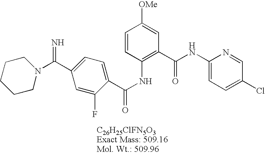 - PWRVGCQUUKBRGU-LIUXSCBKSA-N C/N=C(\C1=CC=C(C(=O)NC2=C(C(=O)NC3=CC=C(Cl)C=N3)C=C(OC)C=C2)C=C1)N(C)C.N=C(C1=CC=C(C(=O)NC2=C(C(=O)NC3=CC=C(Cl)C=N3)C=C(OC(F)(F)F)C=C2)C=C1)N1CC1 Chemical compound C/N=C(\C1=CC=C(C(=O)NC2=C(C(=O)NC3=CC=C(Cl)C=N3)C=C(OC)C=C2)C=C1)N(C)C.N=C(C1=CC=C(C(=O)NC2=C(C(=O)NC3=CC=C(Cl)C=N3)C=C(OC(F)(F)F)C=C2)C=C1)N1CC1 PWRVGCQUUKBRGU-LIUXSCBKSA-N 0.000 description 1