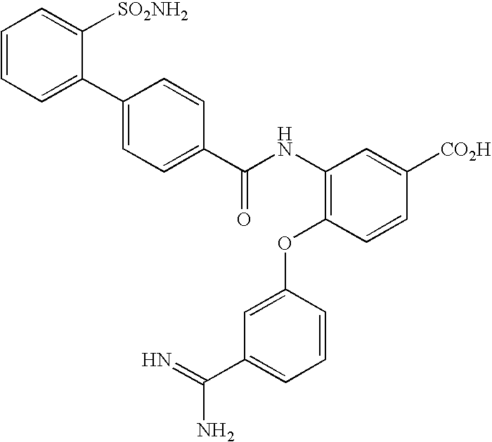 - NSQRNVJINADEIA-UHFFFAOYSA-N CS(=O)(=O)NC1=CC(C(=O)NC2=CC=C(C3=CC=CC=C3S(N)(=O)=O)C=C2)=C(OC2=CC(C(=N)N)=CC=C2)C=C1 Chemical compound CS(=O)(=O)NC1=CC(C(=O)NC2=CC=C(C3=CC=CC=C3S(N)(=O)=O)C=C2)=C(OC2=CC(C(=N)N)=CC=C2)C=C1 NSQRNVJINADEIA-UHFFFAOYSA-N 0.000 description 2