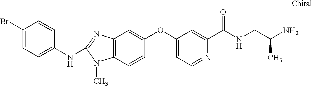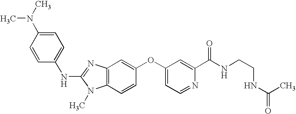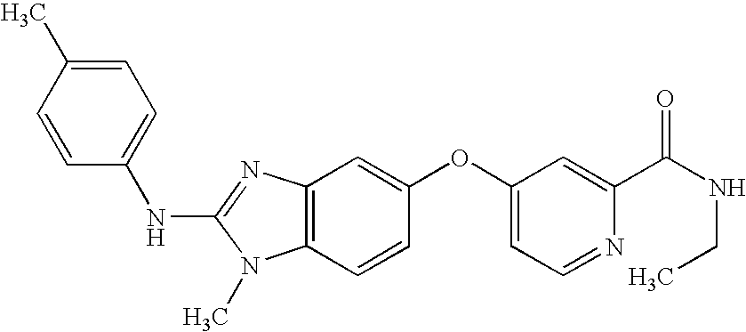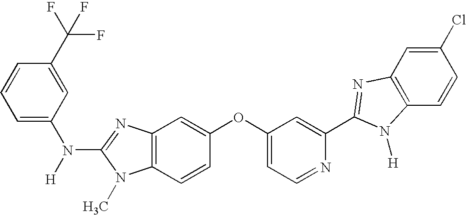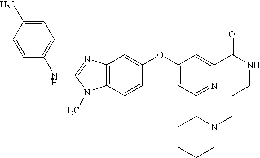 In representative embodiments of the invention, the compounds of the invention include, for example, 4-[(2-{[4-chloro-3-(trifluoromethyl)phenyl]amino}-1H-benzimidazol-6-yl)oxy]-N-methylpyridine-2-carboxamide, 4-({2-[(3-chlorophenyl)amino]-1H-benzimidazol-6-yl}oxy)-N-methylpyridine-2-carboxamide, 4-({2-[(4-bromophenyl)amino]-1H-benzimidazol-6-yl}oxy)-N-methylpyridine-2-carboxamide, 4-({2-[(3-chloro-4-fluorophenyl)amino]-1H-benzimidazol-6-yl}oxy)-N-methylpyridine-2-carboxamide, N-methyl-4-{[2-(phenylamino)-1H-benzimidazol-6-yl]oxy}pyridine-2-carboxamide, 4-[(2-{[4-bromo-2-(trifluoromethyl)phenyl]amino}-1H-benzimidazol-6-yl)oxy]-N-methylpyridine-2-carboxamide, N-methyl-4-({2-[(2-methylpropyl)amino]-1H-benzimidazol-6-yl}oxy)pyridine-2-carboxamide, 4-[(2-{[4-(dimethylamino)naphthalen-1-yl]-amino}-1H-benzimidazol-6-yl)oxy]-N-methylpyridine-2-carboxamide, N-methyl-4-({2-[(4-nitrophenyl)amino]-1H-benzimidazol-6-yl}oxy)pyridine-2-carboxamide, N-methyl-4-({2-[(phenylcarbonyl)amino]-1H-benzimidazol-6-yl}oxy)pyridine-2-carboxamide, N-methyl-4-({2-[(phenylmethyl)amino]-1H-benzimidazol-6-yl}oxy)pyridine-2-carboxamide, methyl 4-{[6-({2-[(methylamino)carbonyl]pyridin-4-yl}oxy)-1H-benzimidazol-2-yl]amino}benzoate, 4-({2-[(4-chlorophenyl)amino]-1H-benzimidazol-6-yl}oxy)-N-methylpyridine-2-carboxamide, 4-[(2-{[2-(ethyloxy)phenyl]amino}-1H-benzimidazol-6-yl)oxy]-N-methylpyridine-2-carboxamide, N-methyl-4-({2-[(2-morpholin-4-ylethyl)amino]-1H-benzimidazol-6-yl}oxy)pyridine-2-carboxamide, 4-({2-[(4-iodophenyl)amino]-1H-benzimidazol-6-yl}oxy)-N-methylpyridine-2-carboxamide, N-methyl-4-[(2-{[4-(trifluoromethyl)phenyl]amino}-1H-benzimidazol-6-yl)oxy]pyridine-2-carboxamide, 4-({2-[(furan-2-ylmethyl)amino]-1H-benzimidazol-6-yl}oxy)-N-methylpyridine-2-carboxamide, 4-({2-[(4-bromo-3-methylphenyl)amino]-1H-benzimidazol-6-yl}oxy)-N-methylpyridine-2-carboxamide, 4-({2-[(4-acetylphenyl)amino]-1H-benzimidazol-6-yl}-oxy)-N-methylpyridine-2-carboxamide, N-methyl-4-({2-[(2,4,6-trimethylphenyl)amino]-1H-benzimidazol-6-yl}oxy)pyridine-2-carboxamide, 4-[(2-{[4-(1,1-dimethylethyl)-phenyl]amino}-1H-benzimidazol-6-yl)oxy]-N-methylpyridine-2-carboxamide, 4-({2-[(2-bromophenyl)amino]-1H-benzimidazol-6-yl}oxy)-N-methylpyridine-2-carboxamide, 4-({2-[(3-bromophenyl)amino]-1H-benzimidazol-6-yl}oxy)-N-methylpyridine-2-carboxamide, 4-({2-[(2-chlorophenyl)amino]-1H-benzimidazol-6-yl}oxy)-N-methylpyridine-2-carboxamide, methyl 3-{[6-({2-[(methylamino)carbonyl]pyridin-4-yl}oxy)-1H-benzimidazol-2-yl]amino}thiophene-2-carboxylate, 4-({2-[(4-bromophenyl)amino]-1H-benzimidazol-6-yl}oxy)-N-{(3R,5R)-5-[(methyloxy)methyl]pyrrolidin-3-yl}pyridine-2-carboxamide, 4-({2-[(4-bromophenyl)amino]-1-methyl-1H-benzimidazol-5-yl}oxy)-N-methylpyridine-2-carboxamide, 4-[(2-{[4-chloro-3-(trifluoromethyl)phenyl]amino}-1-methyl-1H-benzimidazol-5-yl)oxy]-N-methylpyridine-2-carboxamide, N-methyl-4-[(1-methyl-2-{[4-(trifluoromethyl)phenyl]amino}-1H-benzimidazol-5-yl)oxy]pyridine-2-carboxamide, 4-({2-[(4-bromophenyl)amino]-1-methyl-1H-benzimidazol-5-yl}oxy)-N-ethylpyridine-2-carboxamide, 4-({2-[(4-bromophenyl)amino]-1-methyl-1H-benzimidazol-5-yl}oxy)-N-(2-hydroxyethyl)pyridine-2-carboxamide, 4-({2-[(4-bromophenyl)amino]-1-methyl-1H-benzimidazol-5-yl}oxy)-N,N-dimethylpyridine-2-carboxamide, 4-({2-[(4-bromophenyl)amino]-1-methyl-1H-benzimidazol-5-yl}oxy)-N-(2,2,2-trifluoroethyl)pyridine-2-carboxamide, N-(4-bromophenyl)-1-methyl-5-{[2-(pyrrolidin-1-ylcarbonyl)pyridin-4-yl]oxy)}-1H-benzimidazol-2-amine, ethyl (3R)-3-(methyloxy)-4-[({4-[(2-{[4-(trifluoromethyl)phenyl]amino}-1H-benzimidazol-5-yl)oxy]pyridin-2-yl}-carbonyl)amino]piperidine-1-carboxylate, 4-({2-[(4-bromophenyl)amino]-1-methyl-1H-benzimidazol-5-yl}oxy)-N-[2-(dimethylamino)ethyl]pyridine-2-carboxamide, 4-({2-[(4-bromophenyl)amino]-1-methyl-1H-benzimidazol-5-yl}oxy)-N-(tetrahydrofuran-2-ylmethyl)pyridine-2-carboxamide, 4-({2-[(4-bromophenyl)amino]-1-methyl-1H-benzimidazol-5-yl}oxy)-N-(2-morpholin-4-ylethyl)pyridine-2-carboxamide, 4-({2-[(4-bromophenyl)amino]-1-methyl-1H-benzimidazol-5-yl}oxy)-N-(piperidin-4-ylmethyl)pyridine-2-carboxamide, 5-({2-[(3-aminopyrrolidin-1-yl)carbonyl]pyridin-4-yl}oxy)-N-(4-bromophenyl)-1-methyl-1H-benzimidazol-2-amine, 4-({2-[(4-bromophenyl)amino]-1-methyl-1H-benzimidazol-5-yl}oxy)-N-[1-(diphenylmethyl)azetidin-3-yl]pyridine-2-carboxamide, 4-({2-[(4-bromophenyl)amino]-1-methyl-1H-benzimidazol-5-yl}oxy)-N-piperidin-3-ylpyridine-2-carboxamide, 4-({2-[(4-bromophenyl)amino]-1-methyl-1H-benzimidazol-5-yl}oxy)-N-(1,3-thiazol-2-yl)pyridine-2-carboxamide, and 4-({2-[(4-bromophenyl)amino]-1-methyl-1H-benzimidazol-5-yl}oxy)-N-[(1-ethylpyrrolidin-2-yl)methyl]pyridine-2-carboxamide, (4-{2-[(4-bromophenyl)amino]benzothiazol-5-yloxy}(2-pyridyl))-N-methylcarboxamide, (4-{2-[(4-bromophenyl)amino]benzoxazol-5-yloxy}-(2-pyridyl))-N-methylcarboxamide, and other representative compounds set forth in the Examples.