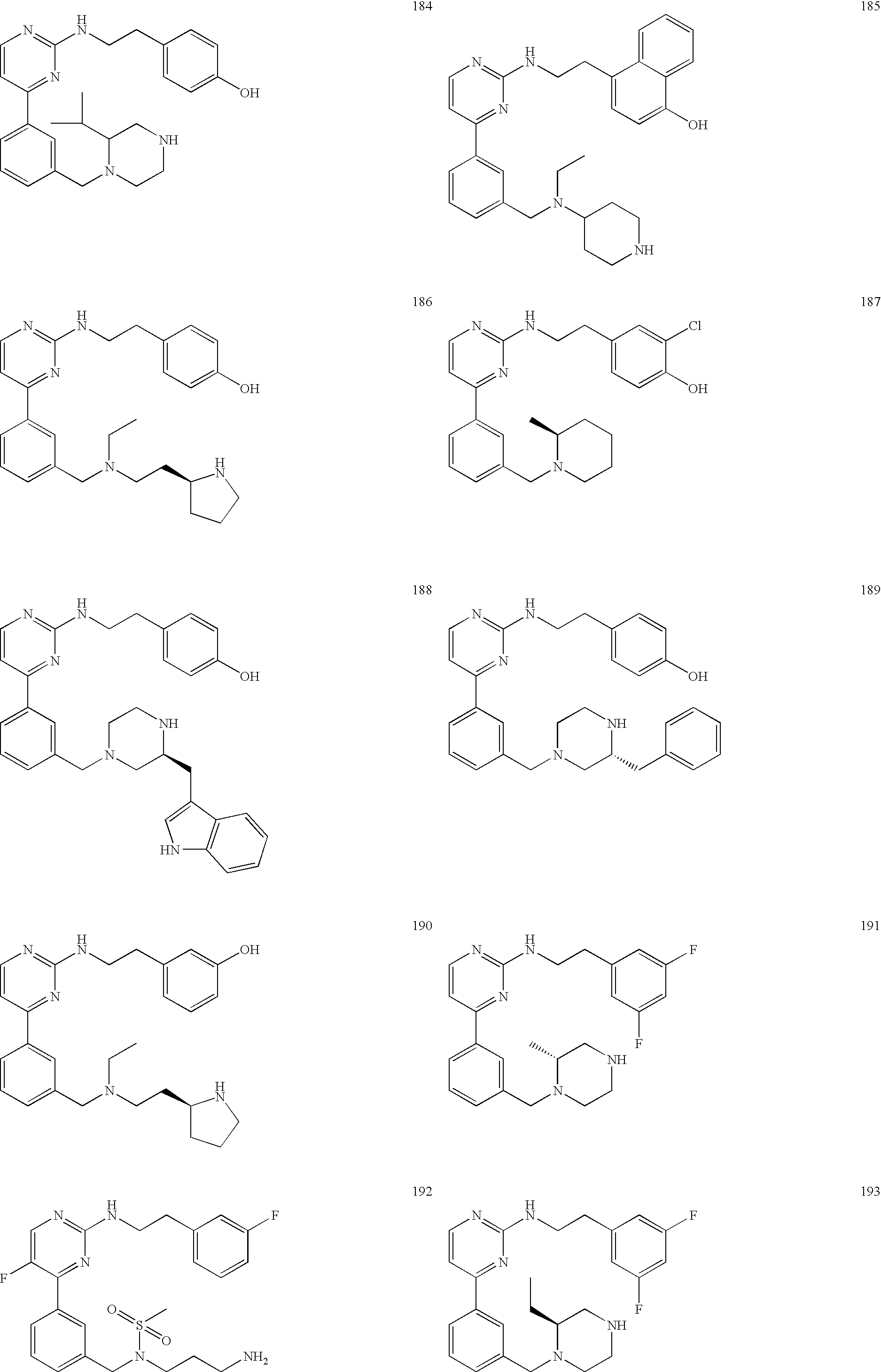 Compound 293: 2-chloro-4-(2-(4-(3-((2(pyridine-3-yl)ethylamino)methyl)phenyl)pyrimidin-2-ylamino)ethyl)phenol: Intermediate 172 from above was coupled with 4-(2-aminoethyl)2-chlorophenol following procedure F. LC-MS showed the product had the expected M+H+ of 460 1H NMR (Varian 300 MHz, MeOD-d6, shifts relative to the solvent peak at 3.31 ppm) δ 8.50-8.43 (m, 2H) 8.29 (d, 1H) 8.21 (s, 1H), 8.1 (d, 1H), 7.7 (d, 1H) 7.63-7.55 (m, 2H), 7.42-7.38 (m, 1H), 7.19 (d, 1H) 7.09 (d, 1H), 6.99 (d, 1H), 6.8 (d, 1H), 4.2 (s, 2H), 3.6 (t, 2H), 3.3 (t, 2H), 3.0 (t, 2H), 2.8 (t, 2H).