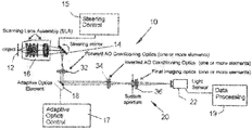 2. In one mode of operation, an image is acquired and the associated light advanced along an optical path that includes an adaptive optics element (e.g. a deformable mirror, a spatial light modulator, an optical phased array, a deformable lens, or similar optical element) to correct for the residual aberrations that are scan position dependant.