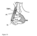 - FIG. 1 is a perspective view of the front, top and left side of a patient's nose showing skeletal components and cartilages. Labeled are the Nose (N), Nasal bone (NB), Left upper cartilage (LUC), Right upper lateral cartilage (RUC), septal cartilage (SC), Right lower lateral cartilage (RLC), and Left lower lateral cartilage (LLC), and Left accessory nasal cartilage (LANC).
