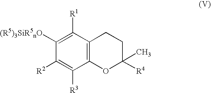 - This embodiment preferably includes the formation of a silylated alkyl ether (—Si—C—O—) on the tocopherol and the formation of a silylated ether without an intermediate hydrocarbon bridge (—Si—O—) or the formation of a silylated ether without a hydrocarbon bridge (—Si—O—) on the tocopherol, each of which is represented below by a preferred the structure in Formula (V):