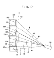 Similarly, a back surface of the screen 622, an upper surface of the ceiling panel 642, a lower surface of the display board 613, and inner surface of the side panels 505 and 506 constitute an inner circumference defining a space including a shoulder part image projecting space 662 which leads the projector image luminous flux projected from a back side of the screen 622 to the back surface of the screen 622 without obstruction.