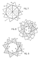 FIG. 7 is an elevational view of the nozzle vanes of FIG. 1 in their closed position, with the front face 14 of the nozzle facing the viewer. As can be seen in this view, the vanes in this embodiment are generally triangular in cross-section, although various other cross-sections may be envisaged. Similarly, because the nozzle in this figure is radially symmetrical, the vanes are self-similar. Each of the vanes contacts one another along side surfaces and can slide along these side surfaces during opening and closing as discussed in greater detail below. As is also visible in FIG. 7, owing to the angle of incline of the vanes to form the generally conical nozzle, the vanes expand outwardly from the front face toward the rear face. Similarly, owing to the skew angle indicated in FIG. 1, the vanes are slightly twisted or rotated from their position at the front face to their position at the rear face (see FIGS. 8 and 9). This combination of incline and skew results in an overlap in the vanes that varies from the front face to the rear face.