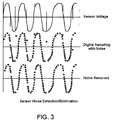 FIG. 3 is a graph illustrating sensor output voltage with noise, sensor sampled voltage, and sensor sampled voltage with noise removal according to an exemplary embodiment of the present invention;