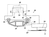 - This figure illustrates a situation where the sheet S has jammed between the print surface 26 ′ and the nozzle face on the bottom side of the printhead 34 , so that the carriage 30 has been tilted about the central axis of the cylindrical rod 36 .