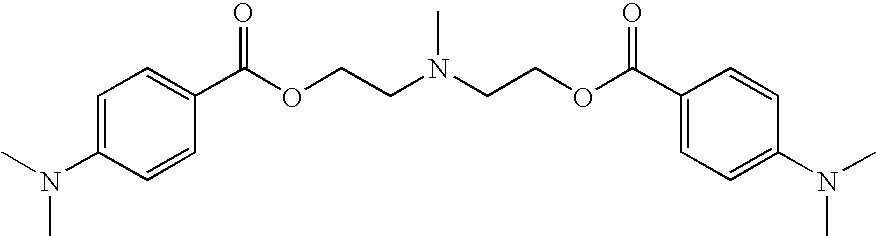 The coinitiators of formula I can be prepared by methods which are well known by the man skilled in the art, in particular by acid catalysed reaction of 4-dimethylamino benzoic acid or its correspondent acyl chloride in the presence of a base, such as pyridine or triethylamine, with a diol like methyldiethanolamine, or with a glycol like triethanolamine; or from a salt of 4-dimethylaminobenzoic acid by reaction with the correspondent alkyl bromide, tosylate or mesylate; or by transesterification of 4-dimethylaminobenzoic acid ethyl ester under acid or basic catalysis with the diols and glycols listed above (cfr. Journal of Macromolecular Science. Chemistry A12 (5), 661-669).