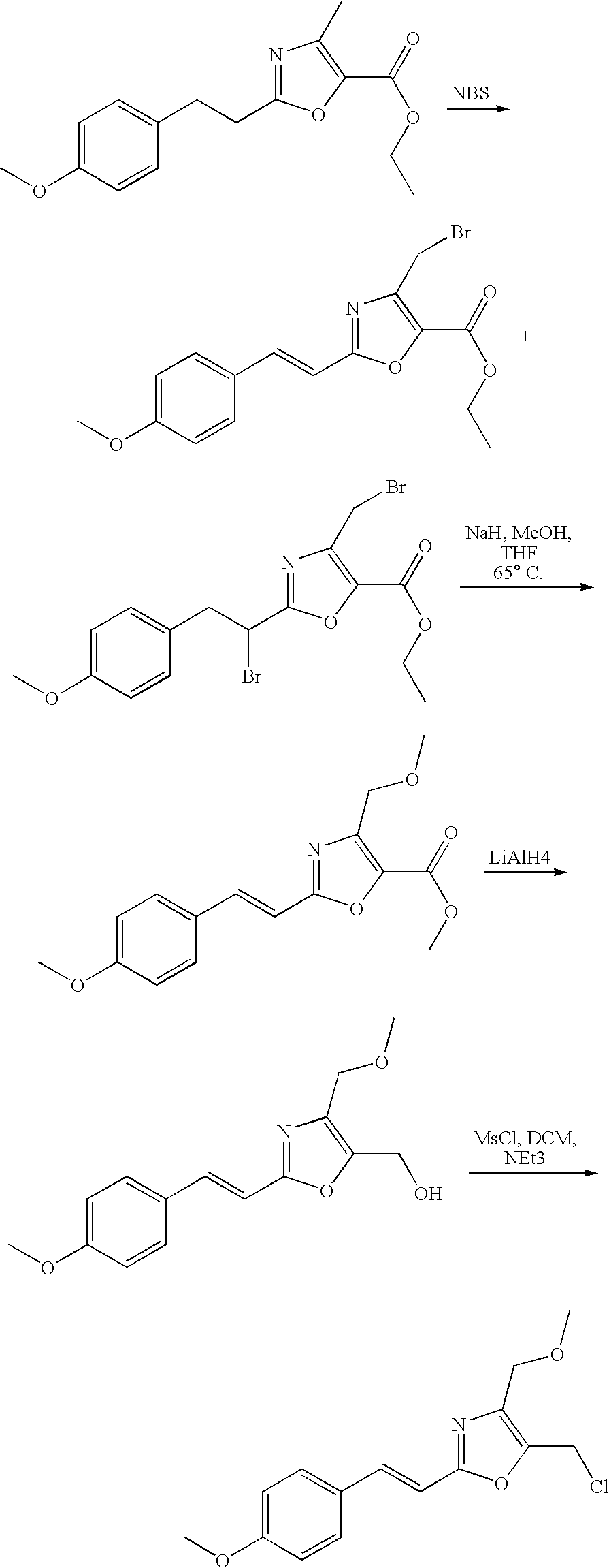 To a solution of 100 mg of 3-{4-[4-(3-hydroxy-propyl)-2-(4-trifluoromethyl-phenyl)-thiazol-5-ylmethoxy]-2-methoxy-phenyl}-4H-[1,2,4]oxadiazol-5-one in 1 mL of dimethylformamide at 0° C. were added 0.077 mL of triethylamine and 0.015 mL of methanesulfonyl chloride. The resulting mixture was stirred at 0° C. for 30 minutes and then concentrated under reduced pressure. The product was dissolved in 3 mL of dimethylformamide. To the resulting solution were added 5.5 mg of sodium methanethiolate and 13 mg of potassium iodide. The reaction mixture was heated for 10 minutes to 90° C. under microwave irradiation in a sealed tube. It was then concentrated under reduced pressure, taken into dichloromethane, washed with water, dried over magnesium sulfate, filtered, and concentrated under reduced pressure to give 20 mg of 3-{2-methoxy-4-[4-(3-methylsulfanyl-propyl)-2-(4-trifluoromethyl-phenyl)-thiazol-5-ylmethoxy]-phenyl}-4H-1,2,4-oxadiazol-5-one.