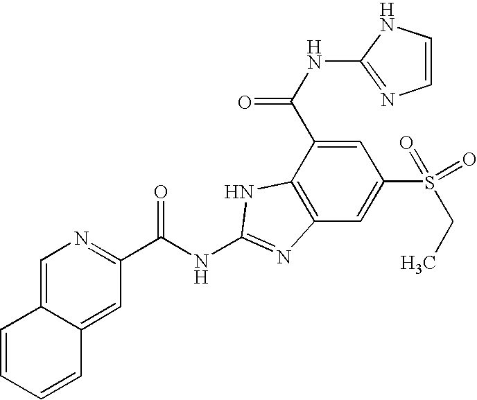 62 mg (0.15 mmol) of 6-ethylsulfonyl-2-[(isoquinoline-3-carbonyl)-amino]-3H-benzoimidazole-4-carboxylic acid and 200 mg (0.53 mmol) of HBTU were dissolved in 1.0 mL of DMF and 0.5 mL of DIEA and treated with 132 mg (1.0 mmol) of 2-aminoimidazole sulfate as described in general procedure A. After the reaction was complete, diluted with brine 10 (mL). The resulting solid was filtered, washed with water, EtOAc and dried under vacuum to produce 36 mg (57%) of isoquinoline-3-carboxylic acid [5-ethanesulfonyl-7-(1H-imidazol-2-ylcarbamoyl)-1H-benzoimidazol-2-yl]-amide. LCMS: 490 (M+1)+.
