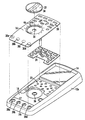 In this case, the set of keys is provided by a single flexible keypad 24 sandwiched between case member 12 a and panel 16. The keys themselves are positioned to extend through apertures 20, whereas their respective posts extend through apertures 22. As shown, these keys may include directional navigation buttons as well as other buttons for selecting particular functions or parameters.