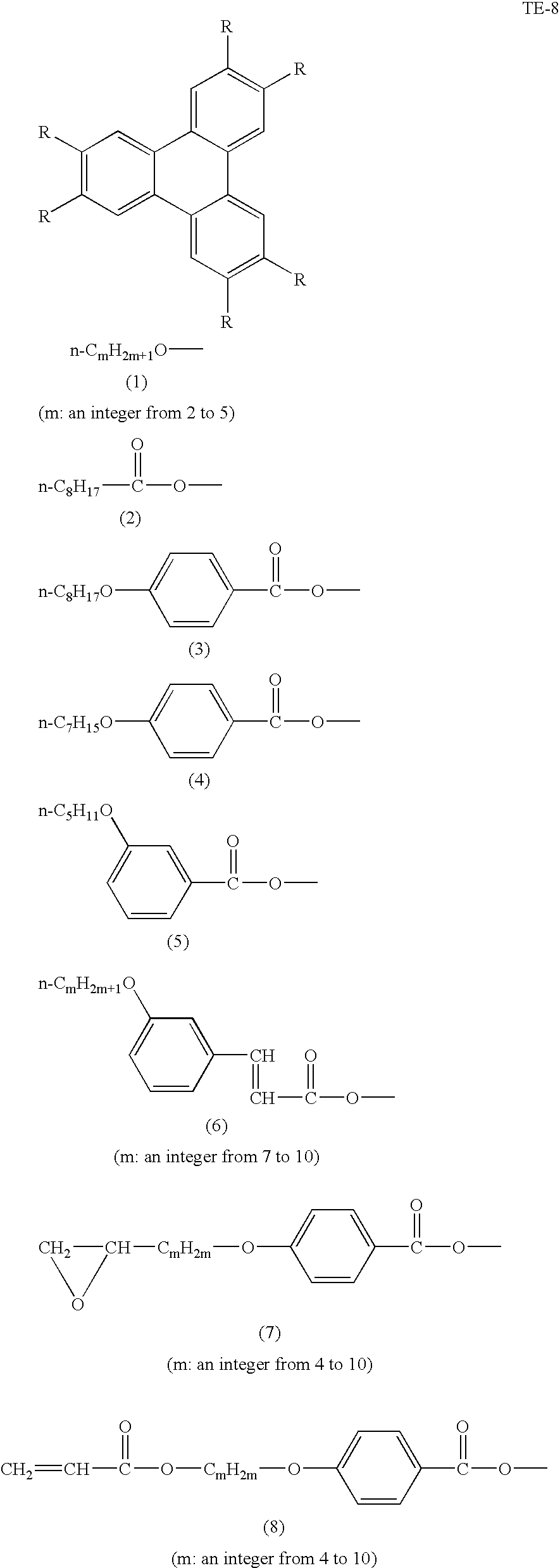 Preferred examples of the discotic core (D), the divalent linking group (L) and the polymerizable group (P) are respectively (D1) to D(15), (L1) to (L25) and (P1) to (P18) described in Japanese Laid-Open Patent Publication (Tokkai) No. 2001-4837; and the descriptions in the publication regarding the discotic core (D), the divalent linking group (L) and the polymerizable group (P) may be preferably applicable to this embodiment.