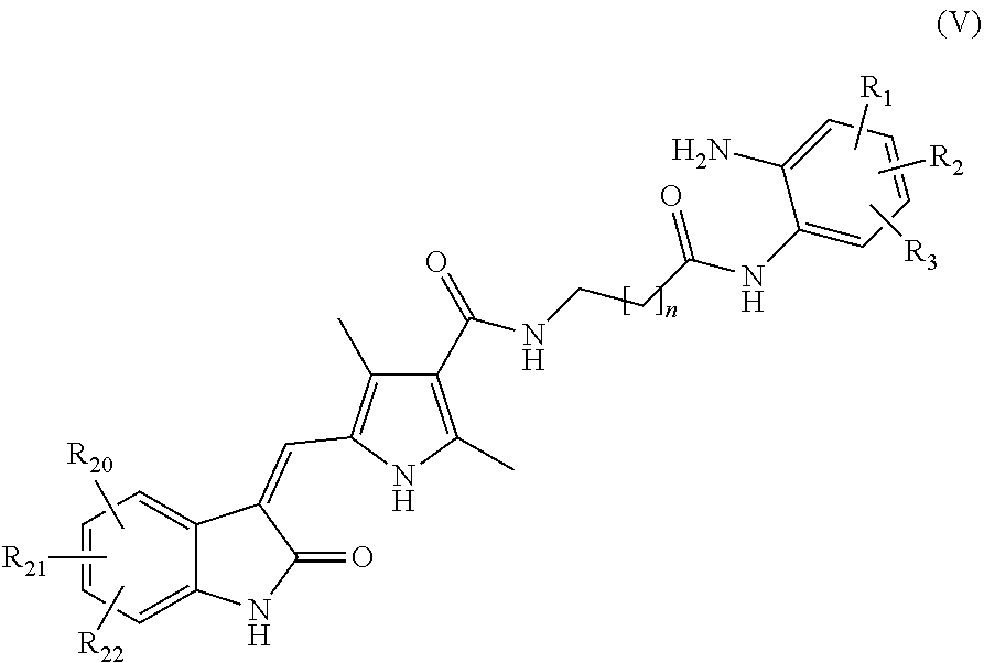 The following TABLE B lists compounds representative of the invention and their activity in HDAC, VEGFR2 and PDGFR assays. In these assays, the following grading was used: I≧10 μM, 10 μM>II>1 μM, 1 μM>III>0.1 μM, and IV≦0.1 μM for IC50.