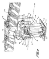 A pair of arcuate tracks 150, 152 are bolted to an outer carriage frame assembly 154, and a plurality of roller mechanisms, four for engaging each one of the arcuate tracks 150, 152 but only one of which is visible at 156 in FIG. 2, although all four of one set are disclosed within FIGS. 3A-3C, are mounted upon, for example, the inner carriage frame assembly 146 and also ride upon the arcuate tracks 150, 152 so as to permit the pivotal movement of the nailing gun 115 to occur as a result of the rolling movement of the rollers 156 along the arcuate tracks 150, 152. More particularly, in order to in fact achieve the aforenoted different firing modes of the nailing gun 115, it is further seen that a pair of forward and rearward piston- cylinder assemblies 158, 160 are disposed in a back-to-back position and are bolted together by means of a pair of transversely oriented mounting plates 162. Since the piston- cylinder assemblies 158, 160 are disposed in their back-to-back fashion, it is to be appreciated that the piston rods 157, 159 of each piston- cylinder assembly 158, 160 are disposed in opposite directions with respect to each other. For example, a gooseneck-shaped clevis-type mounting bracket 164 is integral with and projects downwardly from the outer carriage assembly 154, and it is seen that a forwardmost portion 166 of the piston rod 157 of the forward piston-cylinder assembly 158 is fixedly bolted between the end portions of the gooseneck-shaped clevis type mounting bracket 164. Conversely, the rearwardmost portion 168 of the piston rod 159 of the rearward piston-cylinder assembly 160 is operatively connected to and interposed between a pair of linkage members 170, only one of which is shown in FIGS. 3A-3C, so as to be respectively connected to the inner carriage frame assembly 146.