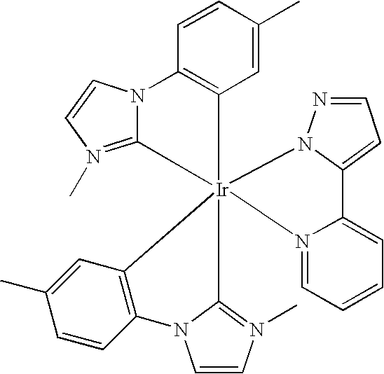 - TWCLKIUYKXIIAI-UHFFFAOYSA-N CC1=CC=CC(N2=C3N(C(C)=C2C)C2=C(C=CC(C)=C2)[Ir]324(C3=C(C=C(C)C=C3)N3C(C)=C(C)N(C5=CC(C)=CC=C5)=C32)N2N=C(C(F)(F)F)C=C2C2=CC=CC=N24)=C1.CC1=CC=CC(N2=C3N(C(C)=C2C)C2=C(C=CC(C)=C2)[Ir]324(C3=C(C=C(C)C=C3)N3C(C)=C(C)N(C5=CC(C)=CC=C5)=C32)N2N=NN=C2C2=CC=CC=N24)=C1.CC1=NN2C(=N1)C1=CC=CC=N1[Ir]213(C2=C(C=C(F)C=C2)N2C(C)=C(C)N(C4=CC(F)=CC=C4)=C21)C1=C(C=C(F)C=C1)N1C(C)=C(C)N(C2=CC(F)=CC=C2)=C13 Chemical compound CC1=CC=CC(N2=C3N(C(C)=C2C)C2=C(C=CC(C)=C2)[Ir]324(C3=C(C=C(C)C=C3)N3C(C)=C(C)N(C5=CC(C)=CC=C5)=C32)N2N=C(C(F)(F)F)C=C2C2=CC=CC=N24)=C1.CC1=CC=CC(N2=C3N(C(C)=C2C)C2=C(C=CC(C)=C2)[Ir]324(C3=C(C=C(C)C=C3)N3C(C)=C(C)N(C5=CC(C)=CC=C5)=C32)N2N=NN=C2C2=CC=CC=N24)=C1.CC1=NN2C(=N1)C1=CC=CC=N1[Ir]213(C2=C(C=C(F)C=C2)N2C(C)=C(C)N(C4=CC(F)=CC=C4)=C21)C1=C(C=C(F)C=C1)N1C(C)=C(C)N(C2=CC(F)=CC=C2)=C13 TWCLKIUYKXIIAI-UHFFFAOYSA-N 0.000 description 1