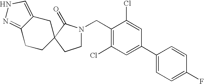 - a further embodiment of the invention are the novel intermediate preparations described herein which are useful for preparing 2-[3,5-Dichloro-4′-(4-trifluoromethyl-piperidine-1-carbonyl)-biphenyl-4-ylmethyl]-2-aza-spiro[4.5]decan-1-one and 2- ⁇ 3,5-Dichloro-4′-[4-(2-fluoro-ethyl)-piperazine-1-carbonyl]-biphenyl-4-ylmethyl ⁇ -2-aza-spiro[4.5]decan-1-one or a pharmaceutically acceptable salt thereof.