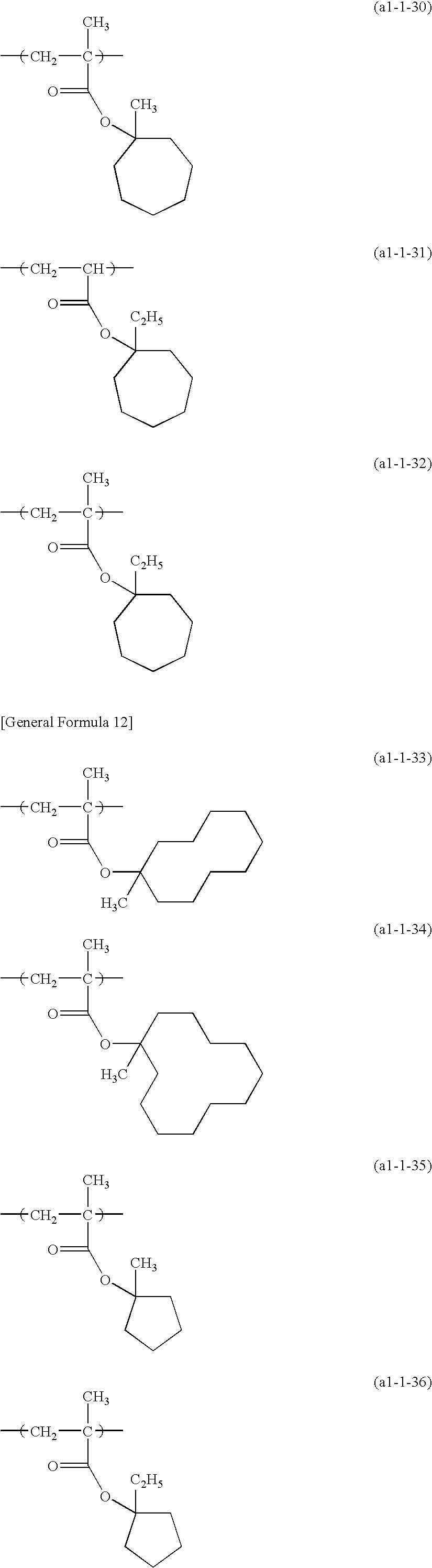 In the present invention, an ‘organic group’ includes carbon atoms and may include other atoms (for example, a hydrogen atom, an oxygen atom, a nitrogen atom, a sulfur atom, a halogen atom (such as a fluorine atom or a chlorine atom) or the like). Examples of monovalent organic groups serving as X are not particularly limited and the ester terminal moiety of (α-lower alkyl)acrylate ester (such as, acid dissociable dissolution inhibiting groups, monocyclic or polycyclic lactone-containing groups, polar group-containing alicyclic hydrocarbon groups, and polycyclic alicyclic hydrocarbon groups) in the structural units (a11) to (a14) described below can be mentioned.
