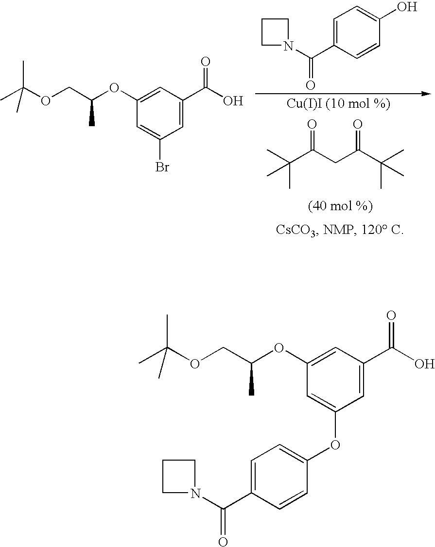 - process b) may be conducted in NMP or benzonitrile, using copper (I) iodide or copper (I) oxide as catalyst, 2,2,6,6-tetramethylheptane-3,5-dione (or N,N-dimethylglycine, but particularly 2,2,6,6-tetramethylheptane-3,5-dione (TMHD)) as ligand and cesium carbonate as base. It is advantageous to use cesium carbonate with a high surface area and carry out the reaction with vigorous stirring.