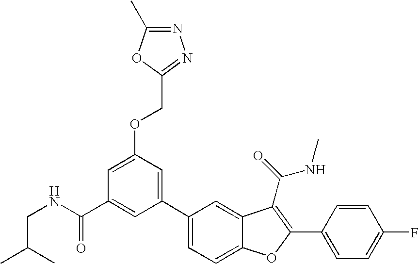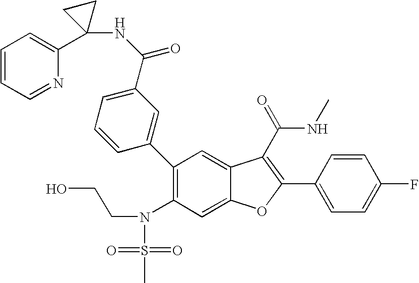 5-(5-(1-(4,6-dimethylpyrimidin-2-yl)cyclopropylcarbamoyl)-4-methoxy-2-methylphenyl)-4-fluoro-2-(4-fluorophenyl)-N-methylbenzofuran-3-carboxamide. To a mixture of 5-(4-fluoro-2-(4-fluorophenyl)-3-(methylcarbamoyl)benzofuran-5-yl)-2-methoxy-4-methylbenzoic acid (50 mg, 0.11 mmol), crude 1-(4,6-dimethylpyrimidin-2-yl)cyclopropanamine (100 mg) in 2 ml DMF at room temperature was added BOP (100 mg, 0.22 M, 2.0 eq.) and triethyl amine (0.046 ml 0.33 M, 3.0 eq.), and the mixture stirred overnight under an N2 atmosphere. The mixture was poured into crushed ice, and the solid precipitate was filtered and dried. The product obtained was further purified by preparative HPLC. Yield: 15 mg (24%) 1H NMR (400 MHz, CD3OD): δ 7.97-7.94 (m, 2H), 7.89 (s, 1H), 7.51 (d, J=8.5 Hz, 1H), 7.31-7.25 (m, 3H), 7.19 (s, 1H), 7.14 (s, 1H), 4.11 (s, 3H), 2.96 (s, 3H), 2.48 (s, 6H), 2.31 (s, 3H), 1.86-1.83 (m, 2H), 1.55-1.52 (m, 2H). 19F NMR (376.57 MHz, CD3OD) δ−77.40 (TFA), −112.33, −122.75 (CFCl3 as reference).