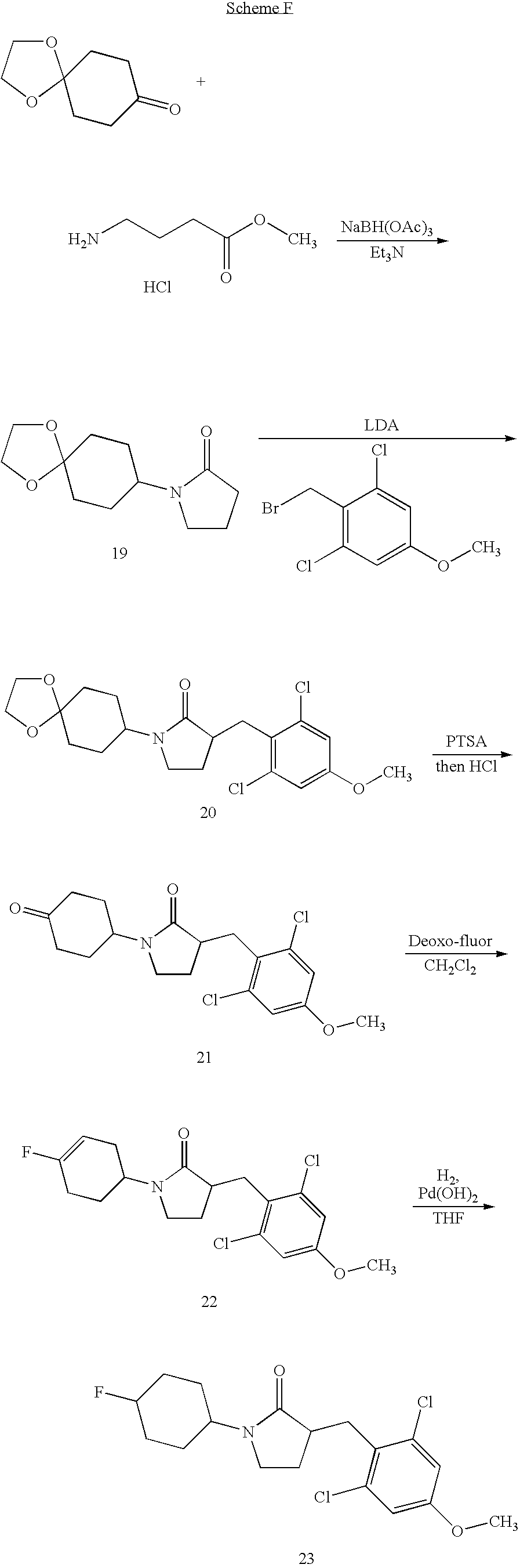 To a solution of trans-1-(4-fluoro-cyclohexyl)-pyrrolidin-2-one (Preparation 24) (20 mg, 0.11 mmol) in 3 mL dry THF, add 0.165 mL of 2M LDA (1.5 eq.) in THF dropwise at −78° C. Then, add 16 mg of 4-Bromo-1-bromomethyl-2-chloro-benzene (2 eq) at −78° C. Allow the resulting solution to stand at room temp for overnight. Quench the mixture with saturated aqueous NH4Cl and extract with CH2Cl2. Wash the organic layer with water, brine, dry over Na2SO4, filter and concentrate. Purify the crude material by chromatography to afford 10.5 mg of the title compound: mass spectrum (m/z): 389 (M+1).