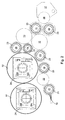 FIG. 3 the schematic view of the part of the printing couple shown in FIG. 1 with a bearing assembly for the printing couple cylinders, and with various rollers, each with its own adjustment device, and in which each of the roller trains is interrupted by a gap;