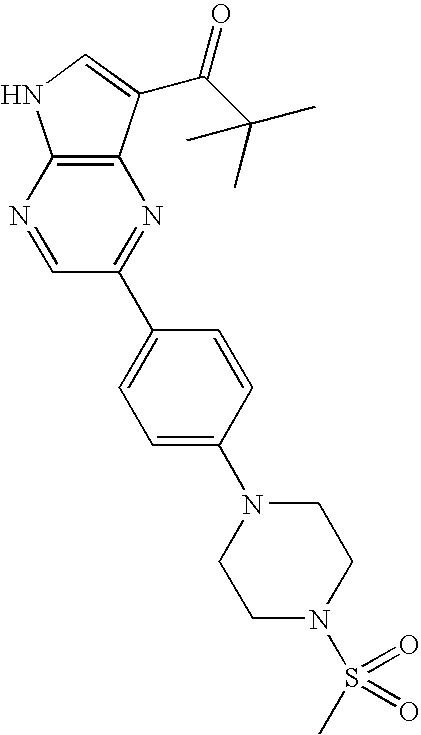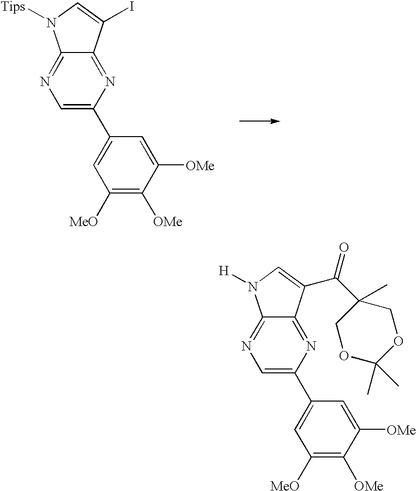 Methyl-cyclohexyl)-[2-(3-pyrrol-1-yl-phenyl)-5H-pyrrolo[2,3-b]pyrazin-7-yl]methanone, (M+H)+=385, was prepared from [2-(3-iodo-phenyl)-5H-pyrrolo[2,3-b]pyrazin-7-yl]-(1-methyl-cyclohexyl)-methanone, protected with a SEM group added as above, using the general procedure described above. Deprotection was carried using TFA as above except that 1M NaOH in THF was used instead of sodium acetate to complete the deprotection.