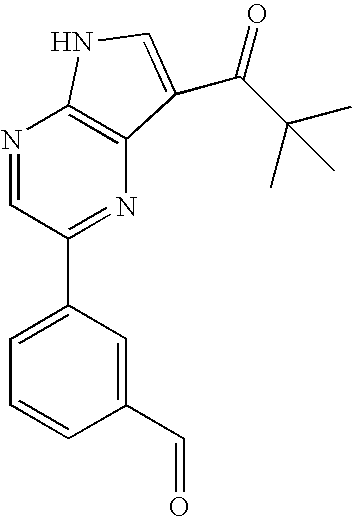 1-[2-(3-Iodo-phenyl)-5H-pyrrolo[2,3-b]pyrazin-7-yl]-2,2,-dimethyl-propan-1-one (150 mg, 0.37 mmol), the oxalate salt of 2-oxa-6-aza-spiro[3.3]heptane (267 mg, 0.93 mmol), potassium carbonate (255 mg, 1.85 mmol), copper iodide (14 mg, 0.074 mmol), and d,l-proline (17 mg, 0.148 mmol) were added to a microwave vial. The vial was capped and purged with nitrogen. DMSO (3.7 ml) was added and the vial was purged with nitrogen again. The reaction was heated in a sand bath at 100° C. for 72 hours. The reaction was poured into ice water, extracted into ethyl acetate, washed with water and brine, dried with sodium sulfate and concentrated. The crude product was purified by flash chromatography using a gradient of 30% to 50% ethyl acetate in hexanes to yield 35 mg (25%) of 2,2-dimethyl-1-{2-[3-(2-oxa-6-aza-spiro[3.3]hept-6-yl)-phenyl]-5H-pyrrolo[2,3-b]pyrazin-7-yl}-propan-1-one as a yellow solid. (M+H)+=377; MP=260.0-262.0° C.