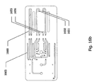 FIGS. 11 a-11 c are top, bottom and isometric views, respectively, of the assay cartridge of FIG. 9; FIG. 11 a illustrates the fluidic networks formed on one side of the cartridge, FIG. 11 b illustrates the fluidic network formed on the other side of the cartridge and FIG. 11 c provides an isometric view with phantom lines to illustrate the entire cartridge fluidic network as seen within the cartridge body.
