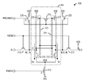 FIG. 2 b shows a detailed view of asymmetric sense amplifier 200. Gates 210 and 212 may be implemented using single transistors, for example, FETs, preferably PMOS transistors, with their gate terminals coupled to the PGENB control signal, as shown in FIG. 2 b. Similarly, a transistor 215 (a FET, such as an N-type metal oxide semiconductor (NMOS) transistor, for example) may be used to enable operation of asymmetric sense amplifier 200 by establishing or breaking a current path depending on the ENABLE control signal. Transistors 220 and 222 may be used to precharge and equalize the data inputs to VDD. Transistors 220 and 222 may be implemented using FETs, such as PMOS transistors with their gate terminals coupled to the PRECHARGE control signal. Alternatively, NMOS transistors may be used in place of the PMOS transistors.