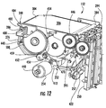 FIGS. 10-12 illustrate transmission of torque from torque source 254 to service cartridge 230 by drive train 288. As shown by FIG. 10, drive train 288 shares gears 440, 442 and 444 with drive train 270. Drive train 88 further includes gears 450, rocker 452, gear 454 and gear 456. Gear 450 is rotatably supported by frame 244 and is in meshing engagement with gear 444. Gear 450 is connected to a shaft 459 (shown in FIG. 12) passing through frame 244 (removed in FIG. 12 for purposes of illustration) to gear 454 which is located on an interior 458 of station 224. Rocker 452 comprises an arm pivotably connected to frame 244 for pivotal movement about axis 460. Rocker 452 includes a projection or tab 462 configured to cooperate with cartridge 230 so as to control pivoting of rocker 452 and gear 456 into and out of engagement with a portion of drive train 288 associated with cartridge 230 as will be described hereafter. Gear 456 is rotatably supported by rocker 452 and is in meshing engagement with gear 454. Gear 456 is configured to be in meshing engagement with a gear of drive train 288 associated with cartridge 230. As will the described hereafter, gear 456 is further configured to be pivoted out of engagement with a gear of cartridge 230 when cartridge 230 is pivoted to a wiping position. Because torque source 254 supplies torque for both linear movement of service station 224 and for driving components of service cartridge 230, system 210 has fewer parts, is more compact and is less costly.