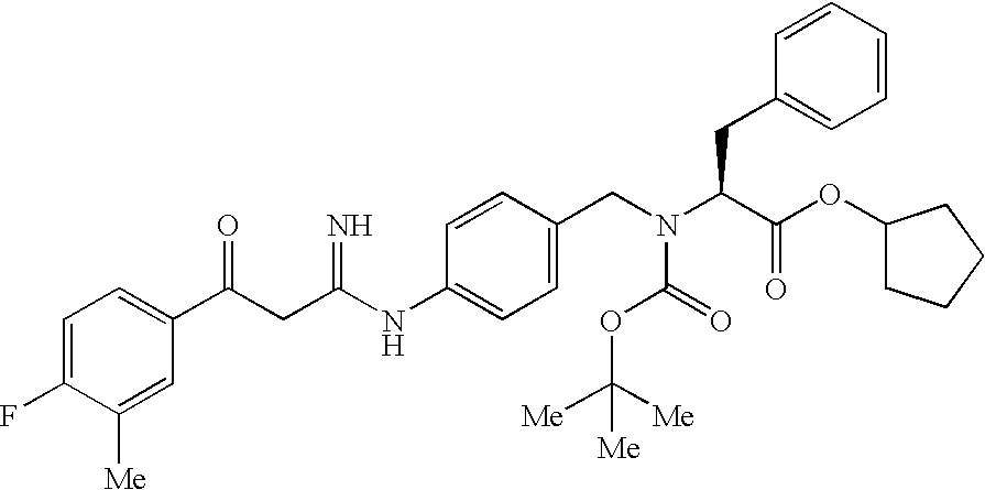 - LNKQBTBPKDFULD-PMERELPUSA-N CC(C)(C)OC(=O)N(CC1=CC=C(NC(=N)CC(=O)C2=CC=C(F)C=C2)C=C1)[C@@H](CC1=CC=CC=C1)C(=O)OC1CCCC1 Chemical compound CC(C)(C)OC(=O)N(CC1=CC=C(NC(=N)CC(=O)C2=CC=C(F)C=C2)C=C1)[C@@H](CC1=CC=CC=C1)C(=O)OC1CCCC1 LNKQBTBPKDFULD-PMERELPUSA-N 0.000 description 2