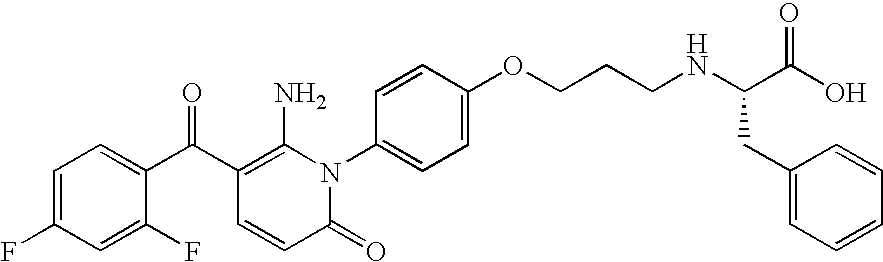 - XDMDIJDMQFPDBX-DEOSSOPVSA-N NC1=C(C(=O)C2=CC=C(F)C=C2F)C=CC(=O)N1C1=CC=C(CN[C@@H](CC2=CC=CC=C2)C(=O)O)C=C1 Chemical compound NC1=C(C(=O)C2=CC=C(F)C=C2F)C=CC(=O)N1C1=CC=C(CN[C@@H](CC2=CC=CC=C2)C(=O)O)C=C1 XDMDIJDMQFPDBX-DEOSSOPVSA-N 0.000 description 2