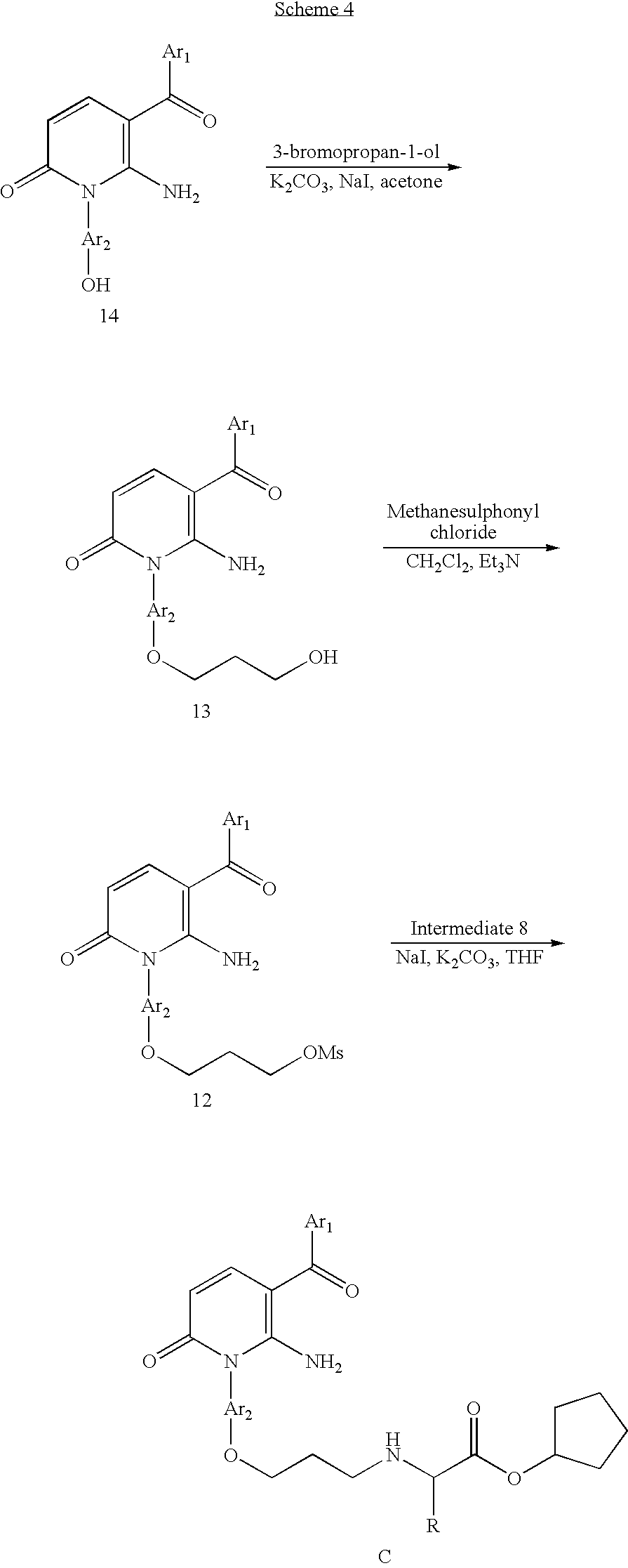 - SABDISQWNLVFNH-UHFFFAOYSA-N CC(=O)CC(=N)NCCCOC(C)=O.CC(=O)CC(=N)SC1=CC=C(Cl)C=C1.CC(=O)OCC[Ar]N1C(=O)C=CC(C(=O)[Ar])=C1N.CS(=O)(=O)OCC[Ar]N1C(=O)C=CC(C(=O)[Ar])=C1N.NC1=C(C(=O)[Ar])C=CC(=O)N1[Ar]CCO.[Ar].[Ar].[Ar] Chemical compound CC(=O)CC(=N)NCCCOC(C)=O.CC(=O)CC(=N)SC1=CC=C(Cl)C=C1.CC(=O)OCC[Ar]N1C(=O)C=CC(C(=O)[Ar])=C1N.CS(=O)(=O)OCC[Ar]N1C(=O)C=CC(C(=O)[Ar])=C1N.NC1=C(C(=O)[Ar])C=CC(=O)N1[Ar]CCO.[Ar].[Ar].[Ar] SABDISQWNLVFNH-UHFFFAOYSA-N 0.000 description 1