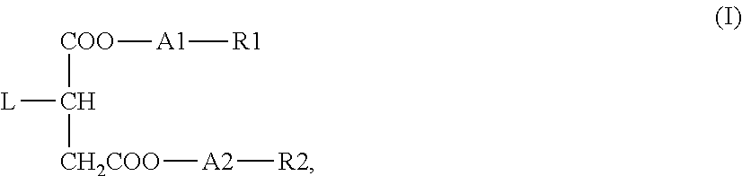 A succinic diester polymer of formula I was produced in the following manner. Polyisobutylene (number average molecular weight of about 910) in an amount of 100 g, maleic anhydride in an amount of 98 g, and xylene in an amount of 20 g were introduced into a reactor. After replacement of the air in the reactor with nitrogen, the temperature was raised to 195° C. and kept there for 24 hours. After removal of maleic anhydride by filtration at 20° C., the yield of polyisobutylene succinic anhydride was determined by anhydride titration to be above 60%, calculated on the conversion of polyisobutylene. The polyisobutylene succinic anhydride obtained from the above reaction was then added to another vessel in an amount of 549 g and further reacted with 494 g of a monomethyl ether of a polyethylene glycol having a molecular weight of about 750, in the presence of 3 g of xylene. The reaction was performed at 220° C. for 8 hours under continuous removal of the water formed during the reaction. Thereupon the temperature was raised to 240° C. and the azeotrope of xylene and water was distilled off at 20 mbar. After cooling to about 100° C. the reaction mixture was filtered under pressure. The reaction mixture obtained contained a succinic polymer of formula I, wherein L represents a polyisobutylenyl group of a number average molecular weight of about 910, R1 and R2 are methyl groups, and A1 and A2 are poly(ethyleneoxy) chains with an average molecular weight of about 750. The HLB value was 12.4. This succinic diester polymer is hereinafter referred to as Succinic Polymer I.