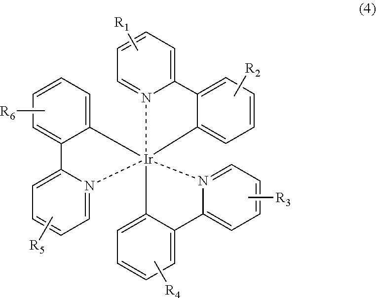 Any solvent that may dissolve the iridium organometallic compound and the electrically conductive polymer may be used for spin coating. At least one solvent selected from the group consisting of chloroform, N-methylpyrrolidone, acetone, cyclopentanone, cyclohexanone, methyl ethyl ketone, ethyl cellosolve acetate, butyl acetate, ethylene glycol, toluene, xylene, tetrahydrofuran, dimethylformamide, chlorobenzene, acetonitrile and mixtures thereof may be used to form the organic active layer by spin coating. A solvent system or solvent mixture of two or more of these solvents in any miscible ratio may also be used.