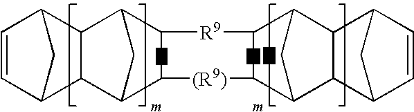 In addition to the norbornene-type monomers represented by Structure C, a “crosslinking monomer” can be also employed. In some embodiments, such crosslinking monomers can be norbornene-type monomers. For example, crosslinked polymers can be prepared by copolymerizing the norbornene-type monomer(s) set forth under Structure C above with a multifunctional norbornene-type crosslinking monomer. By multifunctional norbornene-type crosslinking monomer is meant that the crosslinking monomer contains at least two norbornene-type moieties (norbornene-type double bonds), each functionality being polymerizable in the presence of the catalyst system of the present invention. The crosslinkable monomers include fused multicyclic ring systems and linked multicyclic ring systems. Examples of fused crosslinking agents are illustrated in structures below. For brevity, norbornadiene is included as a fused multicyclic crosslinking agent and is considered to contain two polymerizable norbornene-type double bonds. Crosslinking monomers provide at least one of the following benefits: crosslinking monomers polymerize faster, thus shortening process; they are less susceptible to evaporation during heating steps, thereby suppressing vapor-pressure; and they improve heat-resistance of optical waveguides.