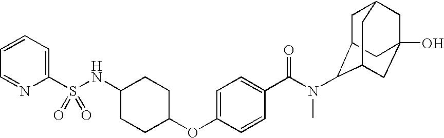 - JEGXRLOALMXVGR-UHFFFAOYSA-N CN(C(=O)C1=CC=C(OC2CCC(NS(=O)(=O)C3=CC=CC=N3)CC2)C=C1)C1C2CC3CC1CC(O)(C3)C2 Chemical compound CN(C(=O)C1=CC=C(OC2CCC(NS(=O)(=O)C3=CC=CC=N3)CC2)C=C1)C1C2CC3CC1CC(O)(C3)C2 JEGXRLOALMXVGR-UHFFFAOYSA-N 0.000 description 3