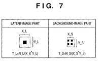 - This copy-forgery-inhibited pattern is formed of two regions, i.e., a region where dots remain after copying and a region where dots disappear after copying. These two regions have substantially the same densities, and a hidden character string or image such as “COPY” cannot be seemingly recognized macroscopically, but these regions microscopically have different properties. Note that the hidden character string or image will be referred to as a “latent-image” hereinafter.