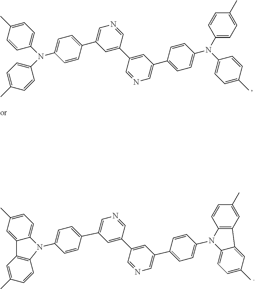 Other embodiments provide a compound selected from optionally substituted 5,5′-bis(diphenylamino)-3,3′-bipyridine, optionally substituted 6,6′-(dicarbazole-9-yl)-3,3′-bipyridine, optionally substituted 6,6′-bis(diphenylamino)-3,3′-bipyridine, optionally substituted 5,5′-(dicarbazole-9-yl)-3,3′-bipyridine, optionally substituted 5,5′-bis(4-diphenylaminophenyl)-3,3′-bipyridine, optionally substituted 5,5′-bis(4-(3,6-dimethylcarbazol-9-yl)phenyl)-3,3′-bipyridine, optionally substituted 5,5′-bis(4-(carbazol-9-yl)phenyl)-3,3′-bipyridine, optionally substituted 5,5′-bis(4-di(4-methylphenyl)aminophenyl)-3,3′-bipyridine, optionally substituted 4,4′-(3,3′-bipyridine-6,6′-diyl)bis(N,N-diphenylaniline), optionally substituted 5,5′-bis(3-diphenylaminophenyl)-3,3′-bipyridine, optionally substituted 5,5′-bis(3-(carbazol-9-yl)phenyl)-3,3′-bipyridine, and optionally substituted 6,6′-bis(4-(carbazol-9-yl)phenyl)-3,3′-bipyridine. In some embodiments, these compounds may be unsubstituted, or have 1, 2, 3, 4, 5, or 6 substituents independently selected from: C1-12 alkyl; CF3; and phenyl having 0, 1, or 2 substituents, wherein the substituents on phenyl are independently C1-3 alkyl or CF3.