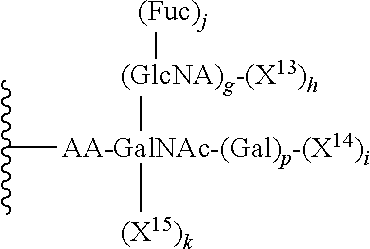 In yet another aspect of the invention, at least one of g, h, i, j, k and p is 1. In another aspect, X14 and X15 are members independently selected from GlcNAc and Sia and i and k are independently selected from the integers 0 and 1. In still another aspect, at least one of i and k is 1, and if k is 1, g, h, and j are 0.