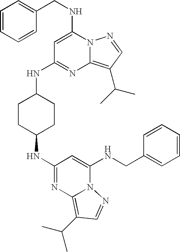 CDKs are important targets for the design of drugs with antimimotic, antineurodegenerative, antiviral and antitumor effects. A few specific and high-affinity inhibitors of some CDKs have been developed using CDK2 as a model system. One of these is flavopiridol (clinical phase I/II), which has modest selectivity for CDKs over other kinases and inhibits many members of the CDK family (M. D. Losiewicz et al., Biochem. Biophys. Res. Commun., 201, 589-595 (1994)). One compound class that has yielded many CDK-selective ATP antagonists is 2,6,9-trisubstituted purines. Within this group, roscovitine shows good biological and pharmacological properties (clinical phase I/II) (S. Wang et al., Tetrahedron: Asymmetry, 12, 2891-2894 (2001); M. Mapelli et al., J. Med. Chem., 48, 671-679 (2005)). Recently, another class of compounds having a pyrazolo[1,5-a]pyrimidine skeleton has been developed. These compounds show a high potency for inhibiting CDK2, and in some cases were shown to inhibit the growth of human colon tumor cells (D. S. Williamson et al., Bioorg. Med. Chem. Lett., 15, 863-867 (2005)). However, most CDK inhibitors that have been described do not specifically inhibit one CDK. For example, most CDK2 inhibitors also inhibit CDK1, CDKS, as well as CDK7 and CDK9 (P. M. Fischer, Cell Cycle 3: 742-746). It has also been noted, however, that some inhibitors of structurally similar kinases CDK1, CDK2 and CDKS do not inhibit CDK4 and CDK6 (M. Knockaert et al., Trends Pharmacol. Sci., 23, 417-425 (2002)).