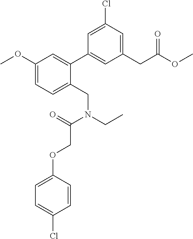 - VYHWGYMYGNYUNZ-UHFFFAOYSA-N CCN(CC1=CC=C(OC)C=C1C1=CC(CC(=O)OC)=CC(Cl)=C1)C(=O)COC1=CC=C(Cl)C=C1 Chemical compound CCN(CC1=CC=C(OC)C=C1C1=CC(CC(=O)OC)=CC(Cl)=C1)C(=O)COC1=CC=C(Cl)C=C1 VYHWGYMYGNYUNZ-UHFFFAOYSA-N 0.000 description 2
