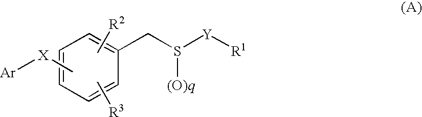 | *Position: the position refers to the position of the ArX lateral side chain as compared to —CH2—S(O)q—Y—R1 group on the central benzyl ring. |