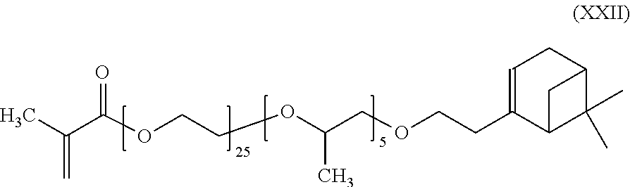 Alternatively, a monomer comprising a polymerizable functional group, such as for example, polyethylene glycol monomethacrylate, can be alkoxylated to form a polyether monomer and the alkoxylated monomer then reacted with the bicycloheptyl- or bicycloheptenyl-intermediate to form the bicycloheptyl-, or bicycloheptenyl-polyether monomer.