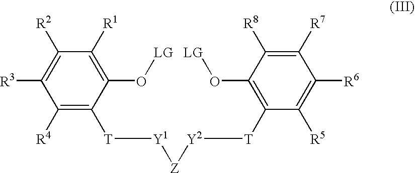 In scheme 3, each R′ is R1-R8, T is ═CR22 2 where R22 is a previously defined with respect to formula III, and LG, Y1, Y2, and Z are as previously defined. In a preferred embodiment T is CH2, Y1 and Y2 are each oxygen, Z is alkylene, and LG is H, Li+ or a Grignard remnant. Generation of quinine methide reagents is well known to the skilled artisan and described in such references as Tetrahedron, 2002, 58, 5367-5405.