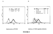 FIG. 4 shows that VEGF peptide antibodies disrupt the normal VEGF-VEGFR interaction by flow cytometry using HUVECs, presumably through depletion of VEGF. (A) Evaluation of the positive (PC), negative (NC) and inhibitor antibody (IC) controls of Fluorokine® assay, and (B) the same PC and NC as in (A), and employing either mouse or rabbit VEGF peptide antibodies, both demonstrating disruption of the normal VEGF-VEGFR interaction. The rabbit antibody labeled as “combo” represents rabbit VEGF peptide antibodies following immunization with both the MVF-VEGF immunogen as well as another immunogen not described in this investigation.